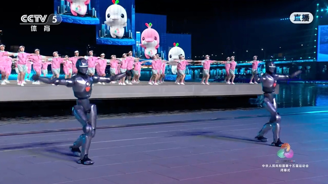 第十五届全运会闭幕式上,人形机器人和真人在转播后表演了体操动作。后面的大屏幕显示吉祥物“大...